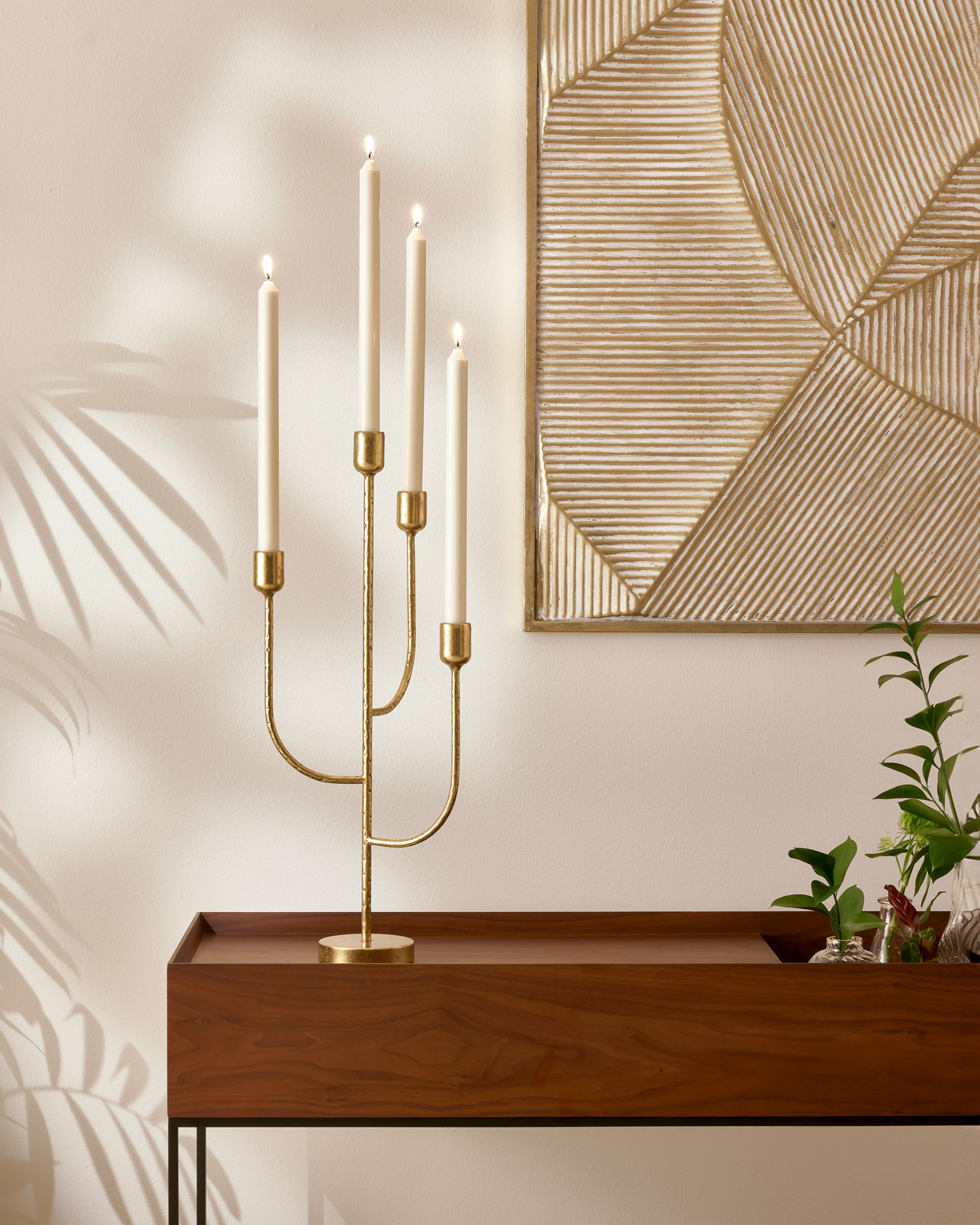 O castiçal para velas, em metal dourado, é uma peça que exala sofisticação e charme. Com um design elegante e moderno, ele é ideal para adicionar um toque de requinte a qualquer ambiente. O brilho do metal dourado capta a luz de maneira envolvente, criando um jogo de reflexos que transforma a atmosfera.