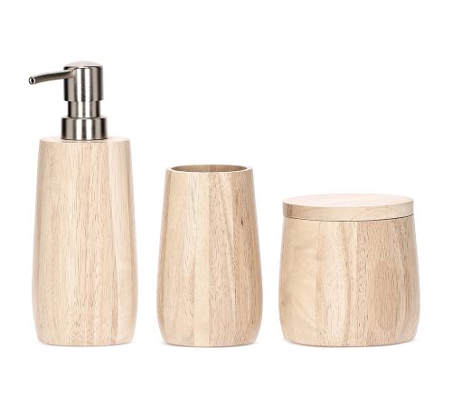 20799 - KIT EM MADEIRA PARA BANHEIRO - 3 PÇSPORTA-SABONETE LÍQUIDO 19,5 x 8COPO 12,5 x 7,5 | POTE 10,5 x 10 cm (AxØ)