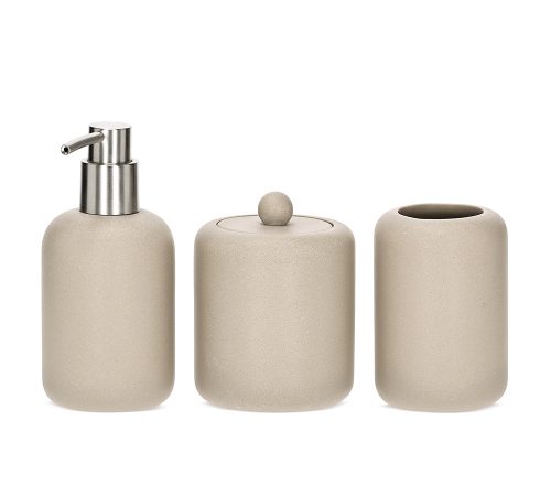 20803 - KIT EM POLIRRESINA PARA BANHEIRO - 3 PÇSCOPO 11,5 x 8 |(AxØ)POTE 12 x 9 |(AxØ) PORTA-SABONETE LÍQUIDO 16 x 8 cm (AxØ)