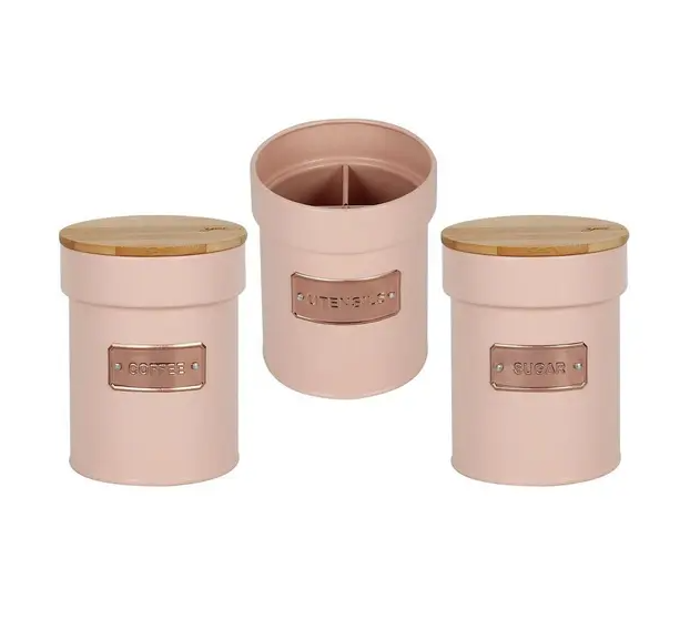Conjunto 3 Potes Porta Condimentos Metal Matte Cozinha Yoi Cor: Rosa A loja Brasil Utilidades Domésticas tr para você mais um produto repleto de requinte e qualidade: Conjunto 3 Potes Porta Condimentos em Metal modelo Matte - Cozinha Yoi Composição do conjunto: 3 peças, sendo elas: 1 Pote Modelo Coffee1 Pote Modelo Sugar1 Pote Modelo Utensils - Modelos Coffee e Sugar: Medidas: 11,5 cm de diâmetro / 14,5 cm altura Capacidade: 1 LMaterial: Corpo: Metal Galvanizado com pintura Tampa: BambuMarca: YoiPeso: 300gLinha: Matte - Modelo Utensils: Medidas: 11 cm de diâmetro / 14 cm altura Material: Corpo: Metal Galvanizado com pinturaDivisória interna removível - 4 espaçosMarca: YoiPeso: 250gLinha: Matte Acessório ideal e prático para guardar mantimentos na cozinha, deixando-os expostos e sempre prontos para o uso a qualquer momento. Feito em metal galvanizado resistente com tampa em bambu e silicone garantindo uma boa vedação. Conta também com um porta utensílios em metal com dizeres em inglês UTENSILS (tradução para o português: Utensílios) em tag de metal arrebitado, com quatro divisórias internas em metal que podem ser removidas para facilitar a limpeza ou para otimizar os espaço interno. Complete sua cozinha com este lindo jogo de latas ideal para armenar seus mantimentos e deixar sua casa ainda mais organizada e elegante. Perfeito para manter a composição da decoração do ambiente sem perder o charme e a funcionalidade. Cores:- Branco- Rosa- Cinza - Imagens meramente ilustrativas.